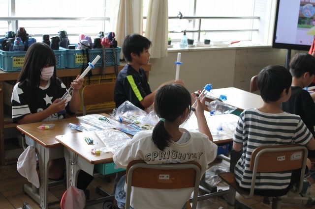 今週4年生は、理科の学習で「空気と水」の学習に取り組みました。一人ひとりキットを使って、閉じ込めた空気に力を加えたときの、手ごたえを感じ取ったり、体積と結びつけたりするなど、しっかり学ぶことができました。