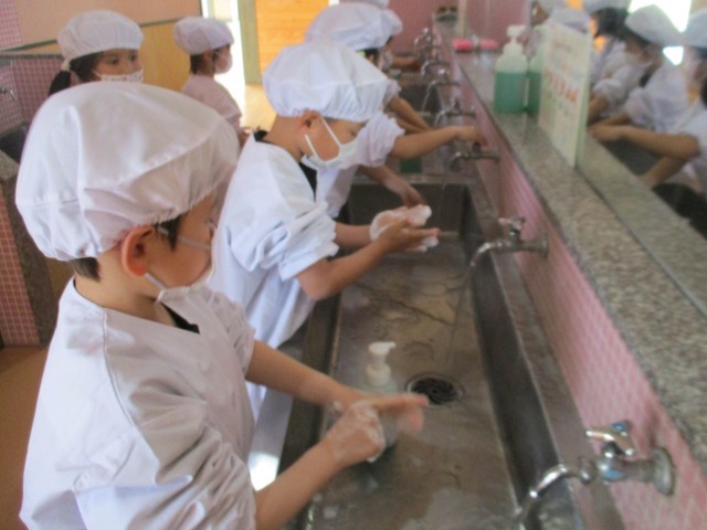 4月15日(水)1年生の給食が始まりました。白衣を着て、手を洗って、食器や食管も...
