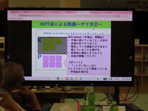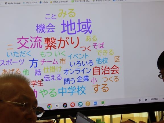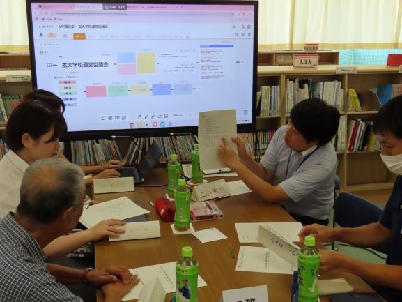 8月20日(水)も暑い日になりましたが、「コミュニティースクール懇談会」と称して、拡大学校運営協議会を開催しました。全教職員と学校運営協議員さん、本校を支えてくださっている4自治会の皆様、そして、PTA本部役員さんにご出席いただき、「湊二小の子供たちに今後、どのように育ってほしいか」について、KPT法を用いた熟議が繰り広げられました。5つの少人数グループにわかれての自己紹介では、参加者一人ひとりの好きなモノや特技などを紹介し合い、この湊二小地区についてのお話なども伺うことができました。今後も毎月のように、学校公開、浜っ子まつり、昔遊びなど、地域の皆様やCSメンバー、PTA役員の皆様の協力なしでは開催できない行事が続きます。より一層の応援をよろしくお願いいたします。