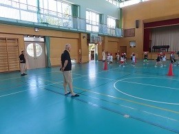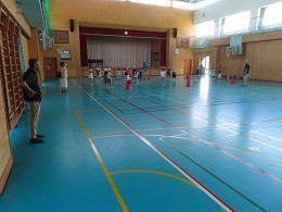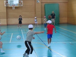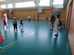 まず、委員の方々に体育館で昼休みの様子を見ていただきました。熱中症予防のため、グランドでの遊びがなしとなり、体育館使用割り当ての1、2年生がドッジボールなどを楽しんでいました。