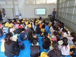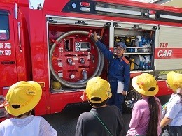 まず、消防署の職員の方から、ひたちなか・東海消防広域事務組合管内や神敷台消防署の署員の数や扱っている業務の種類、火事や救助、救急の出動状況、配備している消防車や救急車などの説明がありました。