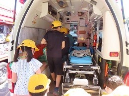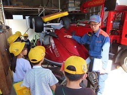 次に、班ごとに実際に消防車や救急車を見学しながら説明を聞きました。中には海の近くならではの水上バイクもありました。最高速度は90Km/hだそうです。