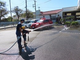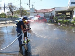 続いて、放水体験を行いました。的に向かって放水したり、ノズルを回すと 水が広がって火事の火から身を守れることを教えていただいたりしました。