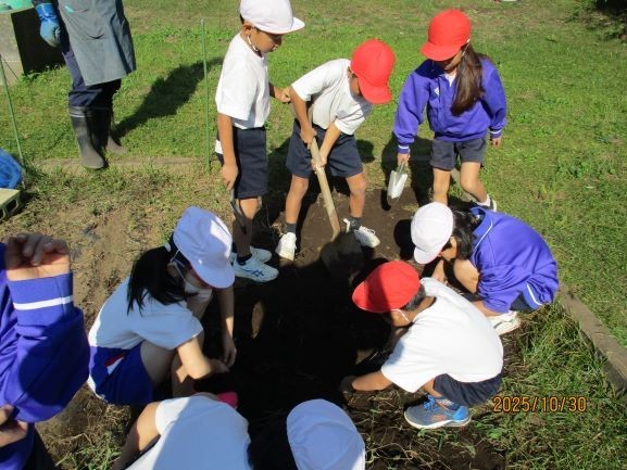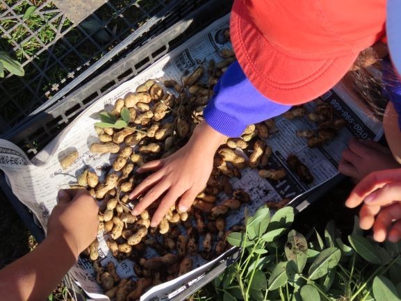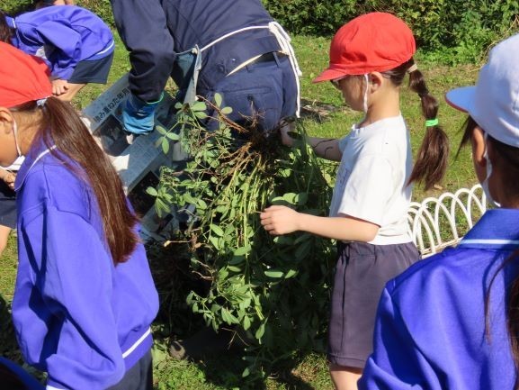 10月30日(木)。今日もよい天気になりました。2年生が育ててきた落花生の収穫をしました。落花生の作りは面白いもので、土の中に実ができます。今夏の暑さと、カラスと戦いながら残った実ですので、貴重品です。今日から乾燥に入ります!