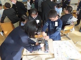 実験用の機械や電線などは高校から持参してくださいました。そして、グループごとに高校生が懇切丁寧にやり方を教えてくださいました。