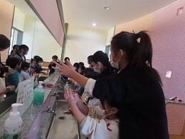 まず、給食の時間に養護教諭から正しく手洗いをすることの必要性や正しい手洗いの仕方の説明がありました。