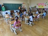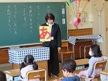 「あいさつ・返事」、「あとかたづけ」、「ありがとう」の、3つの「あ」の話を1年生は一生懸命聞いていました。