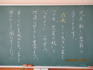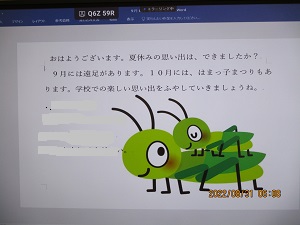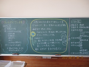 写真は教室の様子です。担任の先生は今日は学校に来て,明日子供たちを迎える準備をしていました。黒板や電子黒板には,子供たちへのメッセージが書かれています。明日から,また一緒に楽しく学校生活を送りましょう。