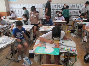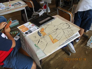 絵画指導その2 公開日 2022/10/04 更新日 2022/10/04 校内行事 3,4,5年生は自分を,6年生は風景を描いています。人物は,肌や髪の毛の塗り方などを工夫していました。風景は,葉の塗り方や空の色の作り方などの助言を受けていました。専門家の方からのアドバイスは,私たちも聞いていてとても勉強になりました。4人の先生方ありがとうございました。それぞれの作品の完成が楽しみです。