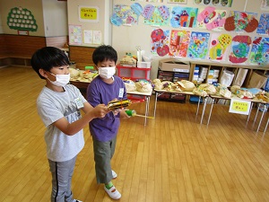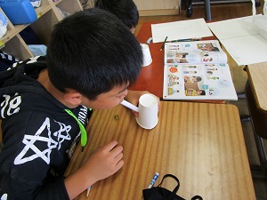 写真は,2年生の生活科の学習の様子です。楽しみながらおもちゃを作っていました。今日は全員共通のおもちゃを作りましたが,次の学習では,思い思いに材料を持ち寄り,各自が工夫しておもちゃを制作するとのことです。どんなおもちゃができるか楽しみですね。