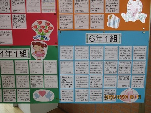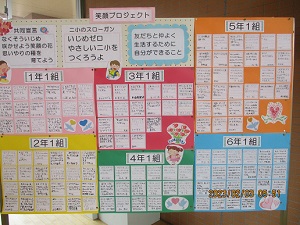 笑顔プロジェクトの活動として「友達と仲良く生活するために自分ができること」を全校児童一人一人が自分の言葉で書き,昇降口に掲示しました。「一人でいる子がいたら声をかける」「あおるようなことはしない」「自分が言われていやなことは言わない」など,様々なことが書かれています。