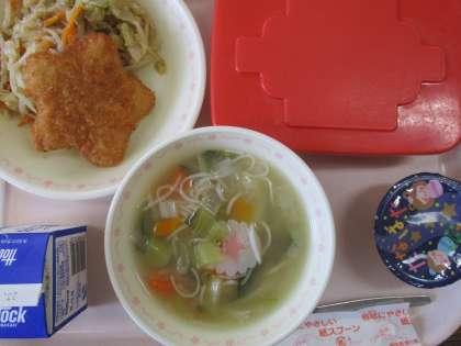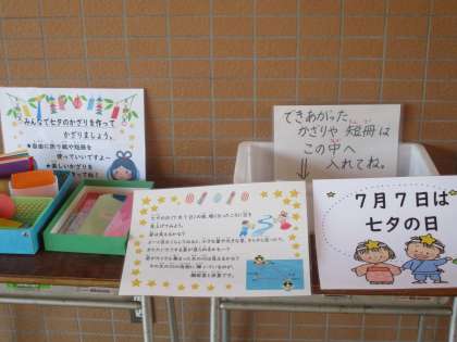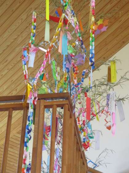 今日は朝からとても暑い1日でした。七夕ということで、今日の給食は七夕メニューでした。笹飾りは吹き抜けの2階にも飾られています。短冊を書いて飾ったり、折り紙で作った飾りがたくさん下げられていたり、とても風流です。この季節ならではの光景です。