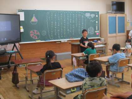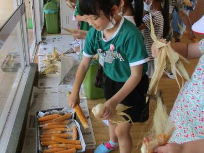 元気に子供達が登校してきました。教室では、宿題を提出したり、夏休みの思い出の作文を書いたり、久しぶりの友達との再会を喜んだりする姿が見られました。2年生はポップコーンにするとうもろこしの皮を楽しそうにむいていました。