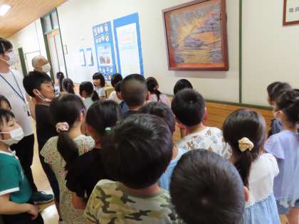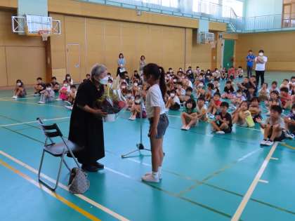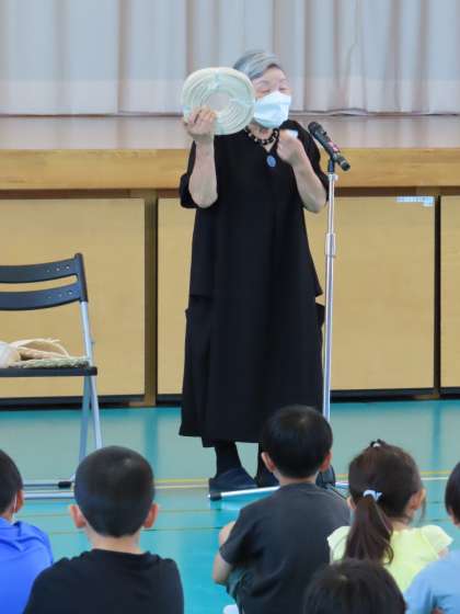 地域の方から、素敵な作品を寄贈していただきました。籐で編んだ「希望の光」という作品で、校長室前の廊下に飾らせていただきました。1日に集会をもち、制作された地域の方にお越しいただき、6年生が代表でお礼の言葉を述べ、5年生の代表児童からお花を贈らせていただきました。思いのこもった大切な作品をありがとうございました。