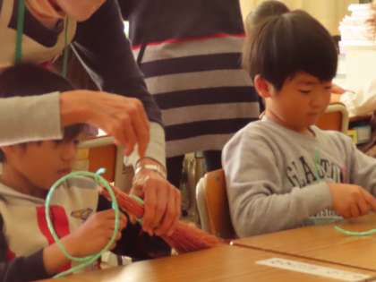 ひたち海浜公園から講師の先生にお越しいただき、コキアでほうきを作りました。こつを教えていただきながら、みんな上手に作ることができました。
