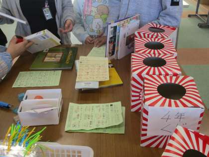 昼休みに本の貸し出しを行っています。今日もたくさんの子供達が本を借りに来ていました。ビンゴカードを使って子供達の読書への興味・関心を高めています。特に低学年の子供達はビンゴになってしおりをもらえたと喜んで見せてくれました。こういった取組をきっかけに本を読む楽しさを味わって欲しいな、と思っています。