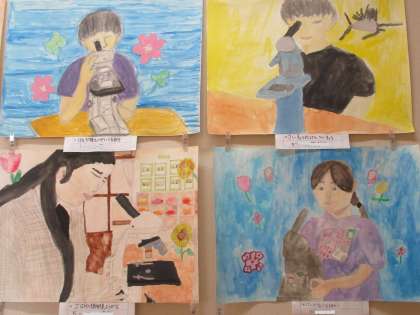 写真は5年生の作品の一部です。顕微鏡をのぞく姿を描きました。のぞき込む目の表情や顕微鏡を支える手が上手に描けています。