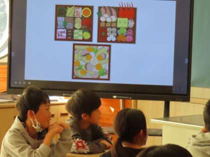 今回のテーマは、「おせち料理」で、それぞれの料理に込められた願いを選択肢から選んで答えていました。先生から正解が示されると、大喜びするグループも見られました。