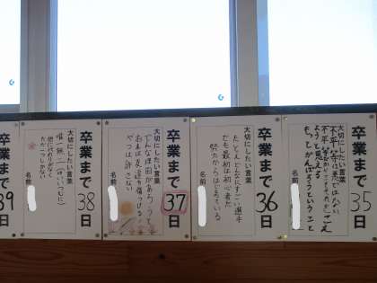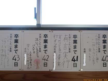 6年生の教室前の廊下に、カウントダウンカレンダーが貼ってあり、大切にしたい言葉が書かれています。卒業式まであと35日。あっという間ですね。一日一日を大切に過ごしていきましょう。