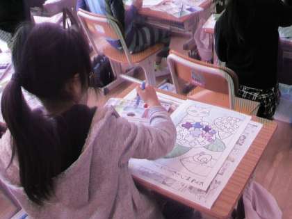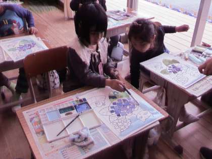 1年生は、絵の具に水を混ぜて色を塗る学習をしていました。べったりと塗らずに上手に水を含ませながら塗ることができるようになってきました。