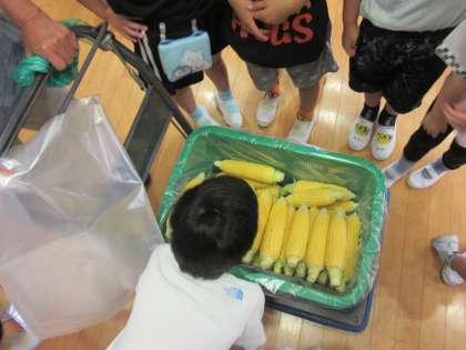 今が旬です! 公開日 2024/07/11 更新日 2024/07/11 校内行事 この季節になると、食べたくなるとうもろこし。 農家さんが早朝に収穫してくださったとうもろこしを、1・2年生が皮むき体験です。 むき方の動画をみて事前学習し、いざ、実践です。皮を1枚1枚丁寧にむいて、ひげもていねいにとって仕上げました。1年生から6年生まで、今日の給食で、おいしくいただきます。