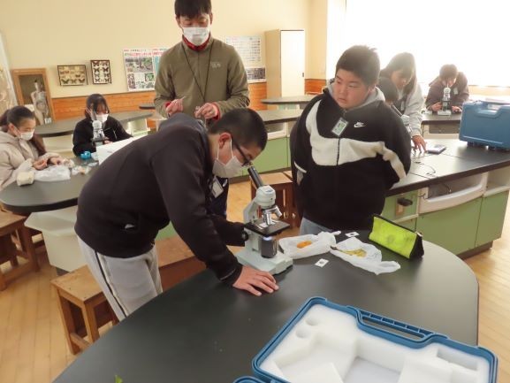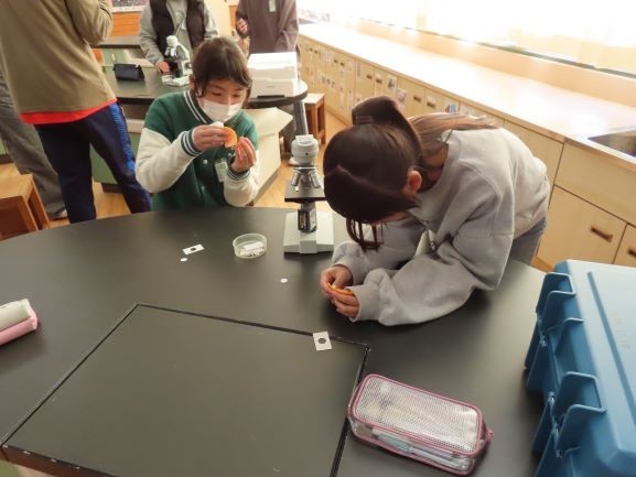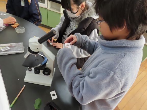 ネギ、ホウレン草、ミカン、バナナ、マツの葉、ツバキ等、多くの観察を行い、細胞の配列を見て「こんなきれいな模様があるんだ」と感動したり、見つかりにくいバナナの皮の気孔を見つけて喜んだり、とても充実した時間を過ごしました。