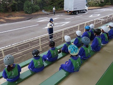 衝突実験を見せてもらったり、自転車の点検の仕方や乗り方について学んだ後、実際にコースを自転車で走行したりしました。