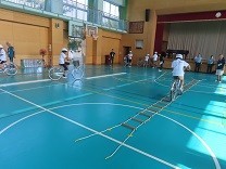 県自転車大会は10日にひたちなか市総合体育館で行われ、県内各地の代表校が集まり、自転車の技術(技能走行と安全走行の実技)や交通安全についての知識(交通規則や道路標識、自転車の安全な乗り方)を競います。