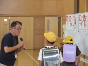 不審者の侵入に対する避難訓練および防犯教室が行われました。不審者役の警察の方がどの教室へ侵入するかは、事前に伝えずに行いました。2年2組へ侵入したのですが、教員の指示に従い、的確に行動することができていました。その後、教員向けにさすまた使用に関する講習を行いました。そして、全員で体育館へ移動し、防犯教室を行いました。「いかのおすし」「いか」行かない、「の」(車に)乗らない、「お」大声を出す、「す」すぐ逃げる、「し」知らせる、の大切さを改めて確認しました。講師の先生の話をみんな真剣に聞いていました。講師の先生もその態度がとてもうれしかった、と感想を述べておられました。