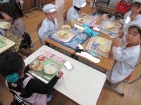 ひたちなか市立那珂湊第三幼稚園の園児が1年生の教室へ来て、一緒に給食を食べました。はじめは、お互い緊張している様子でしたが、だんだんと打ち解けて楽しく給食を食べることができました。