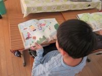 その後、30冊ほどの絵本の中から自分が興味のある本を選び読みました。最後に、プリントに本の内容や面白かった点などをまとめました。