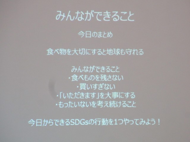 スターバックスコーヒーは、現在、紙のカップの使用量を減らしたり、牛乳パックをリサイクルして、名刺などにして再利用をしたりするなど、SDGsを意識した活動に取り組んでいるそうです。そんな中、自分たちにもできることとして、食べ物を大切にすると地球を守れる、といった話もいただきました。具体的には、食べ物を残さない、買いすぎない、「いただきます」を大事にする、もったいないを考え続けることが大切です、といった話でした。