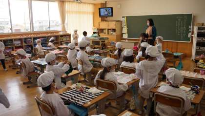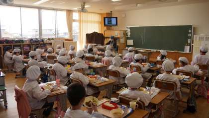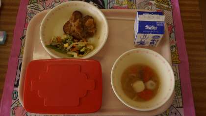 今日の給食の様子です。1年生の様子です。十三夜の給食について,栄養教諭の根本先生から校内テレビ放送がありました。