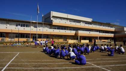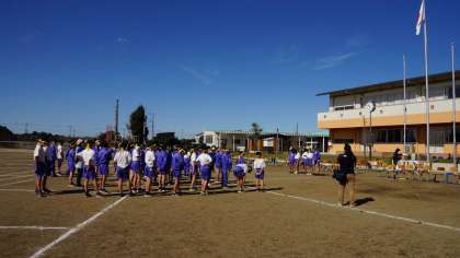 6年生の校内陸上記録会が始まりました。天気にも恵まれて,みんな笑顔で全力を出し切っています。
