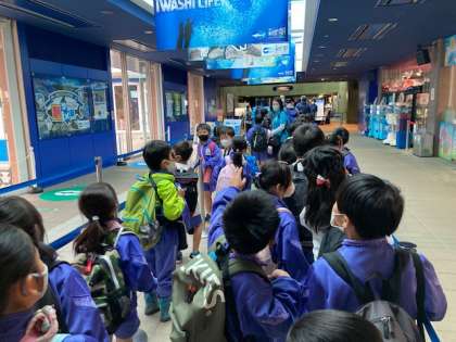 アクアワールドに到着しました。集合写真を撮って、イルカショーを待っています。