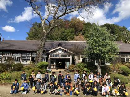 上岡小学校で美味しくお弁当をいただきました。記念の集合写真です。この後,本田りんご園でリンゴ狩りを行う予定です。