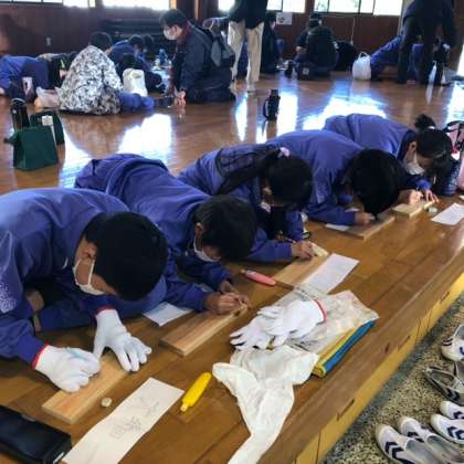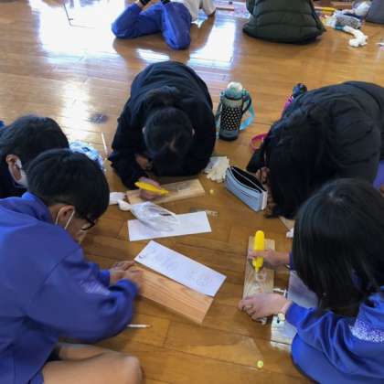 5年生の宿泊学習が始まりました。焼き杉板を作っています。