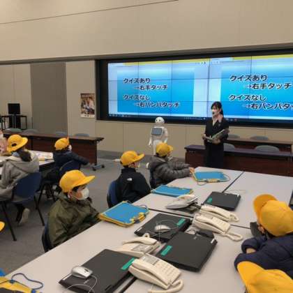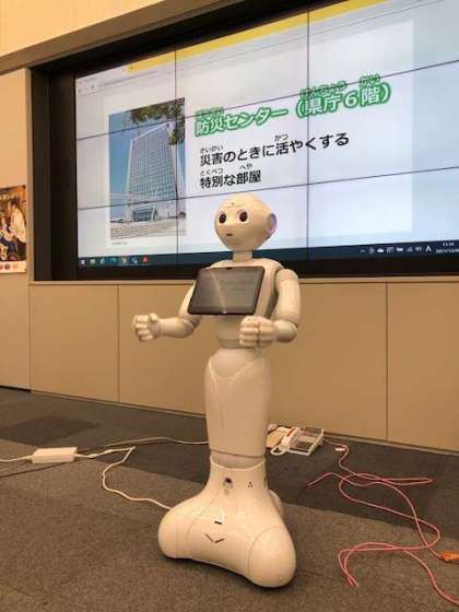 防災センターで、災害について学んでいます。ペッパーくんが地震について教えてくれます。