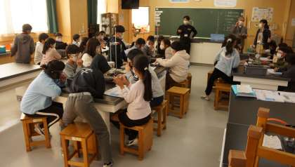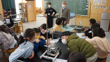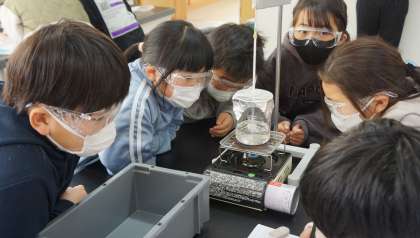 4年2組の理科の授業の様子です。関口先生と真剣なまなざしで実験を行っていました。