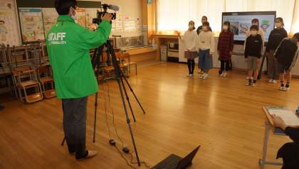 環境シンポジウム 公開日 2022/01/27 更新日 2022/01/27 校内行事 2月15日の環境シンポジウム(オンライン開催)のためのビデオ撮りが行われました。練習の成果もあり,みんな笑顔で撮り終えました。