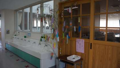 図書室前の廊下に、七夕飾りがあります。みんな願い事を短冊に書いていました。