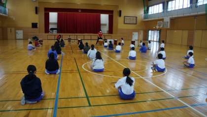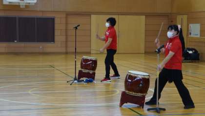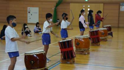 文化芸術による子供育成総合事業による和太鼓学習が、過足先生を講師に迎え5年生で実施しました。5年1組の様子です。
