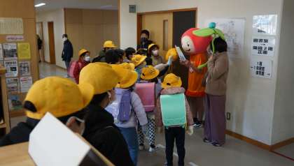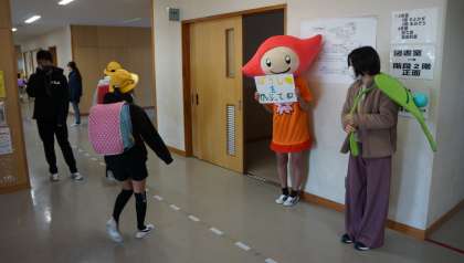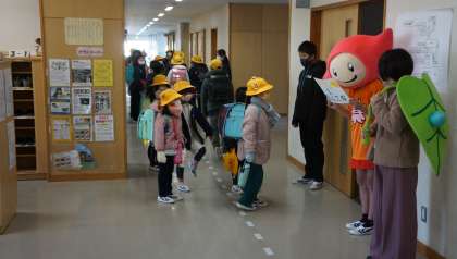 今朝は、ハッピー三ちゃんがあいさつ運動をしていました。