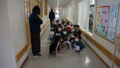 1年2組が,学校探検をしていました。職員室への入り方の練習をしていました。