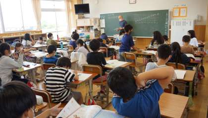 4年1組は音楽でリコーダーの練習を,2組は社会で,ゴミ袋を使った学習を行っていました。