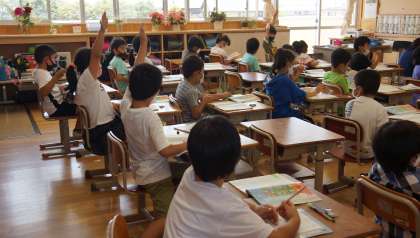 2年1組では,国語の学習で意見発表で,きれいに手が上がっていました。2組は,スイミーの朗読を静かに聞いていました。