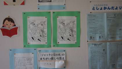 図書室の廊下に,ジャックと豆の木の「まちがいさがし」があります。まちがいが5つありますが,1つどうしても見つからずに,答えを見てしみました。なるほど,と言う答えでした。ぜひ,みなさんもチャッレジしてみてください。
