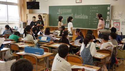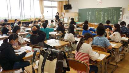 5年1組は,音楽で合奏を,2組は算数の学習を行っていました。