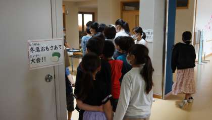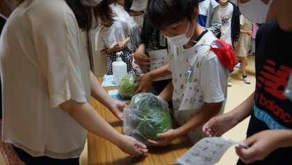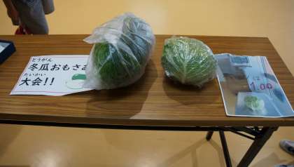 冬瓜のおもさあて大会 公開日 2021/07/05 更新日 2021/07/05 給食日記 今日の給食の食材の「冬瓜(とうがん)」のおもさあて大会が昼休みに行われました。比較に1kgのキャベツがありました。みんな「重いな!」とビックリしながら,両手でもっておもさを考えていました。