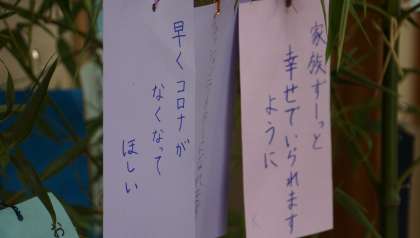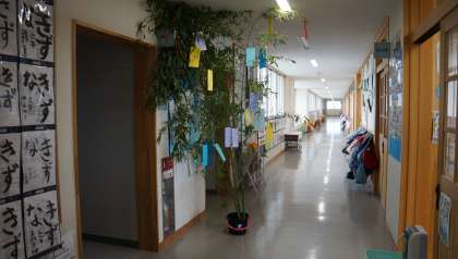 6年生の廊下には,七夕飾りが飾られています。一人一人の願いが短冊に込められていました。